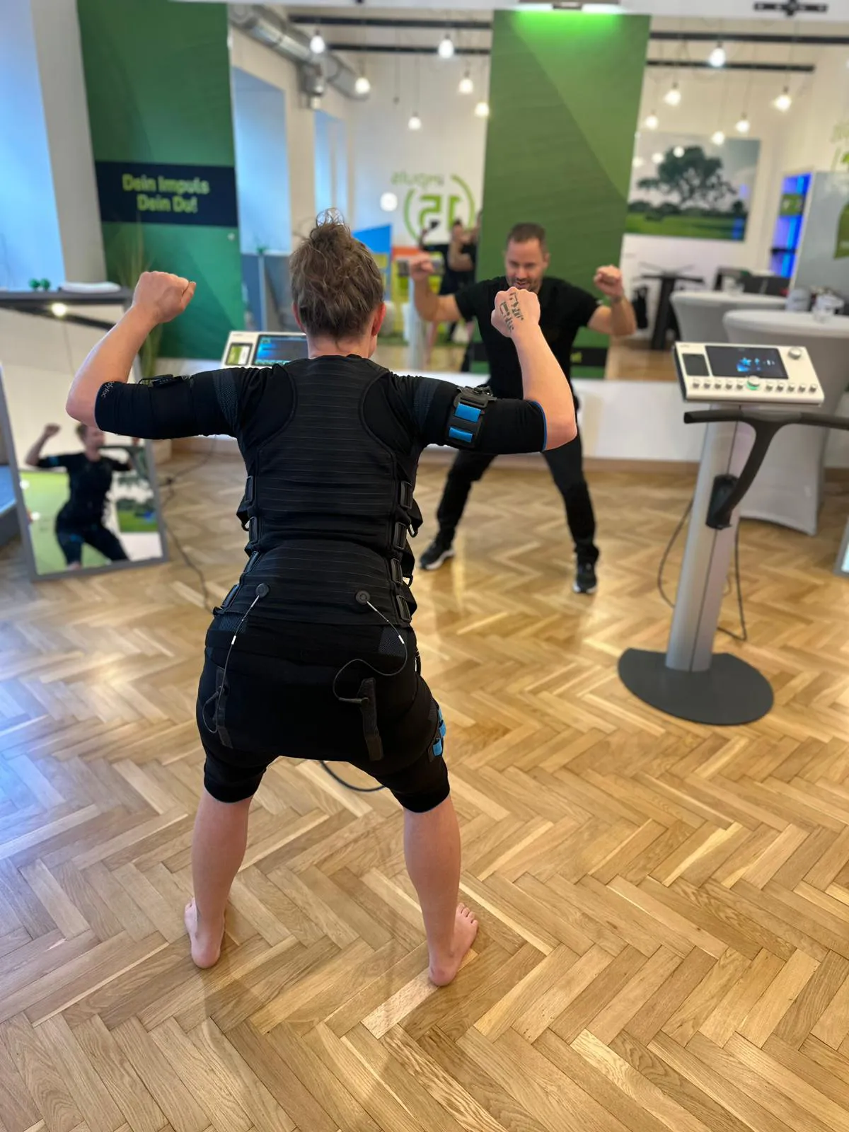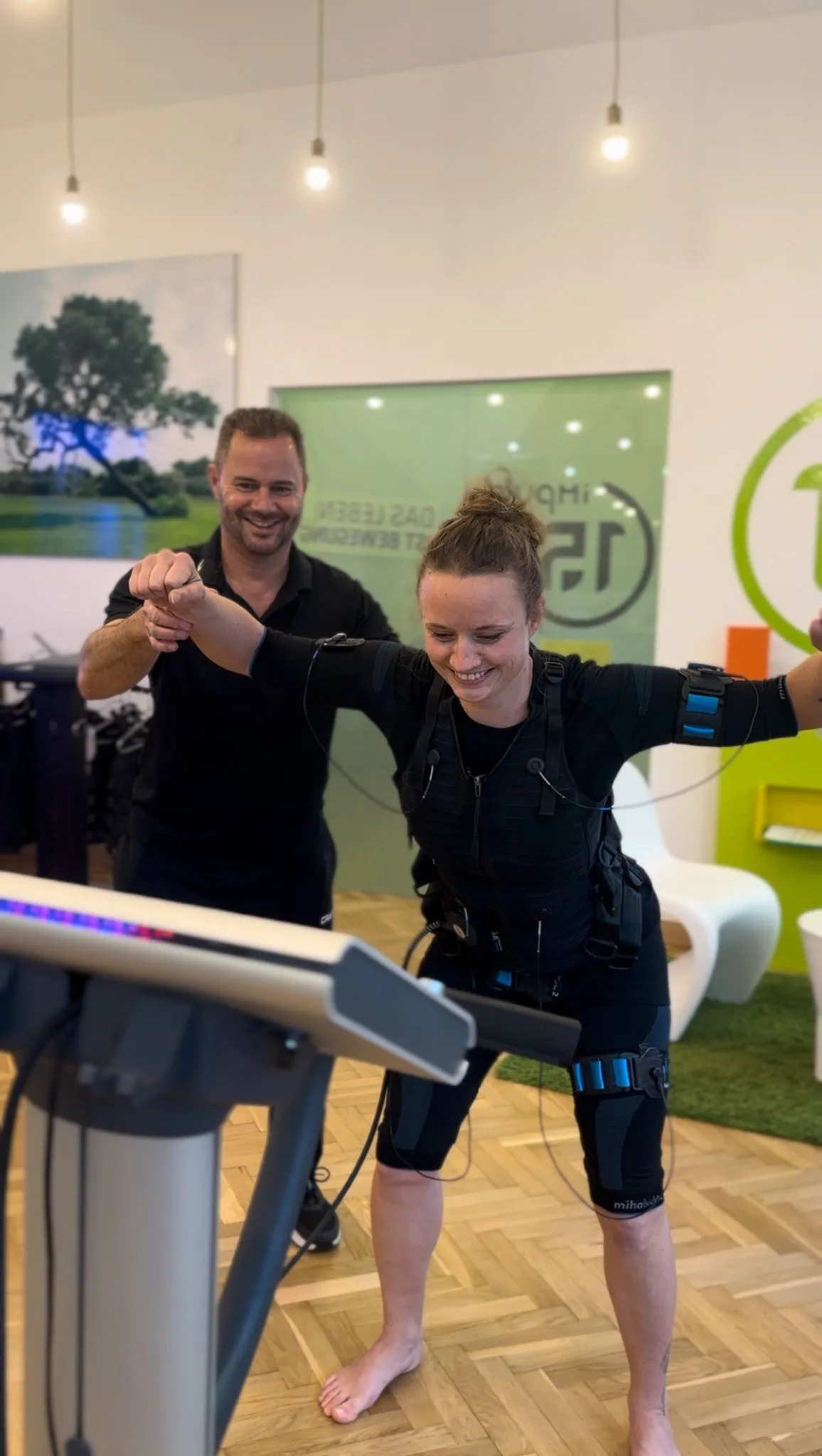 Durch die gezielte Elektrische-Muskel-Stimulation wird dein Körper effektiv und zeitsparend gefordert – ohne Überlastung, aber mit maximalem Effekt. So erreichst du deine Ziele schneller, sicherer und motivierter. Zusätzlich unterstützt EMS deine Leistungsfähigkeit, stärkt dein Herz-Kreislauf-System, schützt Muskeln, Sehnen und Bänder vor Verletzungen und hilft, Verspannungen zu lösen.